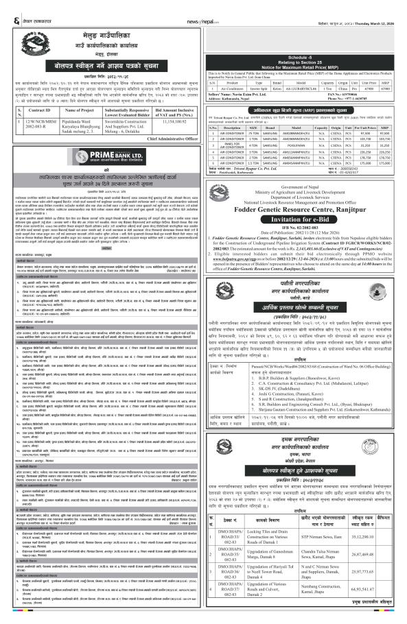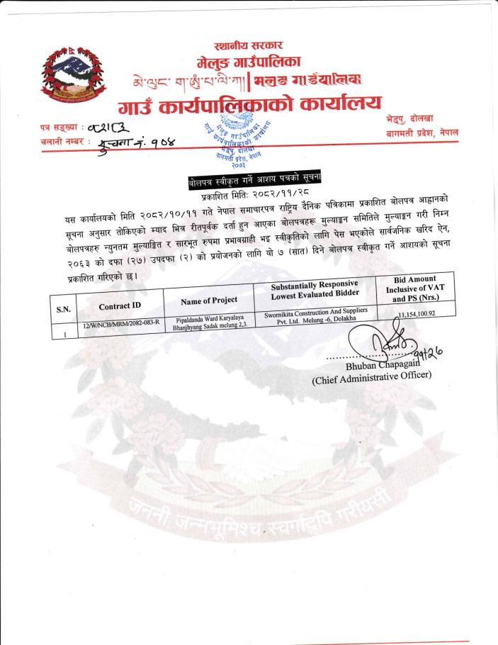 बोलपत्र स्वीकृत गर्ने आशय पत्रको सूचना।।