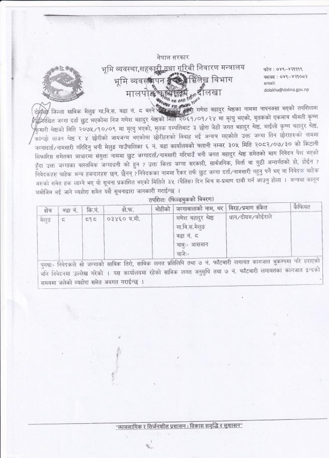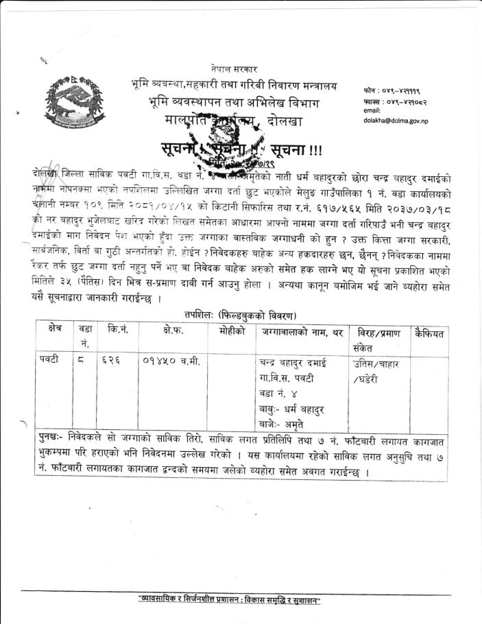 भूमि व्यवस्थापन तथा अभिलेख विभाग मालपोत कार्यालय, दोलखाको सूचना।